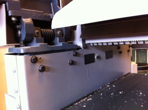 The biggest advantage to this design is space. By a wide margin. A typical centre-mounted North American style fence takes up a considerable amount of space behind the machine for the bar that allows the fence to come across the table. The rear mounting bracket for this fence protrudes about 7 1/2″ off the back of the machine, functioning both as a blade guard for behind the fence and a secondary attachment point to reduce wiggle in the fence. The sales representative said this was done in response to feedback from North American users that want to be able to grab their fences and not be able to move them. For those interested, the second point of attachment made considerably less difference to stability on on the A3-26 than it does to the larger A3-31, presumably because the A3-26’s fence is shorter and provides less leverage for deflection.