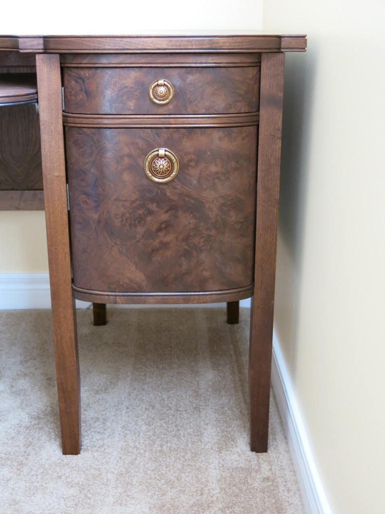 This piece is solid walnut and maple, with only the drawer bottoms made of plywood. The drawers are faced with walnut burl veneer that I applied by heating almost completely dry PVA glue with a clothes iron. Since this is the desk that I do my day job at, the drawers are on metal slides. The bottom drawers are sized for hanging files, one side legal format and the other side letter. I sized the drawers so a vacuum can get underneath easily, and so that I can put my sub-woofer under one of the pedestals.