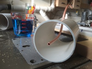 Installing a pre-separator costs you air flow. There is no way around this fact. But then again, a clogged filter costs more. So to get some sense of how much airflow I was losing, I decided to borrow some ideas from Matthias Wandel’s article, Characterizing the cyclone. Specifically, I built a simple manometer and pitot tube with 3/8″ flexible copper tubing, that I bent into a shape that would let me insert it into a scrap piece of 4″ PVC pipe, and I used hot glue to hold it in place. My Manometer is just a length of clear 3/8″ ID vinyl hose that I slipped over the end of the pitot tube and formed into a U shape on some scrap melamine using zip ties. The air flow in the pipe reduces the air pressure in the copper tube, which in turn reduces the air pressure in the clear vinyl hose and sucks the water up the loop a little bit. I used blue food dye to make it show up better in the pictures. The distance that the water is pulled up the tube indicates how much air pressure there is. With some math and a couple of additional setups, you can use pitot tubes to calculate the air velocity and static pressure, which can in turn be used to calculate the total air flow, but I was satisfied with a simple demonstration of the principal without getting into the numbers.
